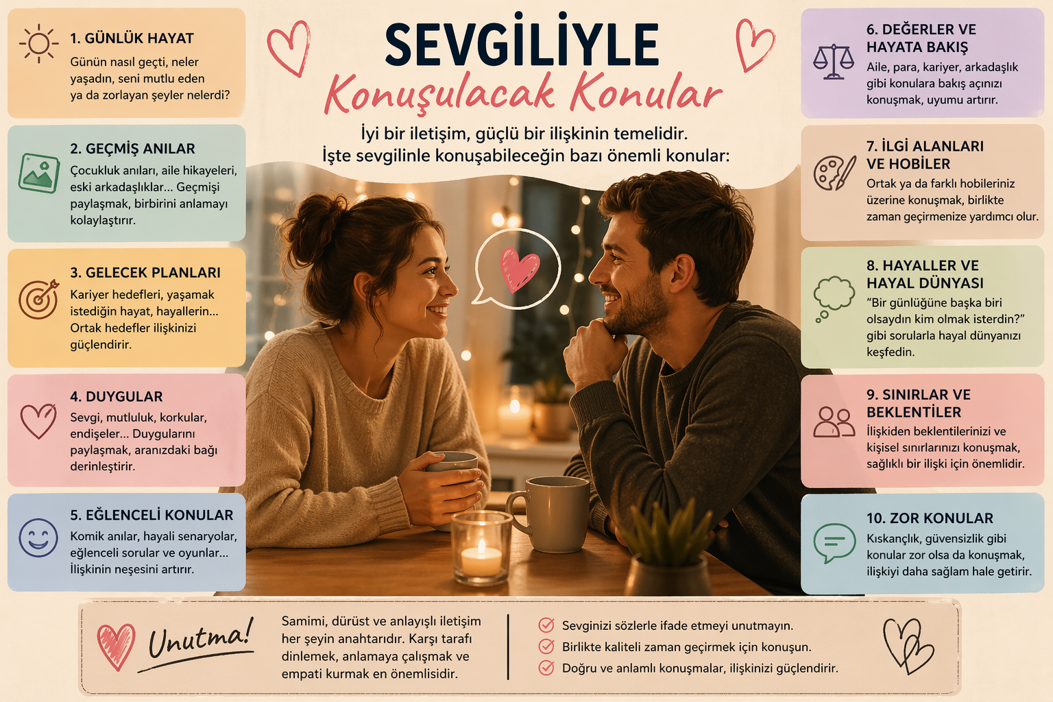 Son olarak, sevgiliyle konuşulacak konuların en önemli özelliği samimi ve doğal olmasıdır. Yapay ya da zoraki sohbetler yerine, içten gelen konuşmalar her zaman daha değerlidir. İletişimde önemli olan çok konuşmak değil, doğru ve anlamlı konuşmaktır. Karşı tarafı gerçekten dinlemek, anlamaya çalışmak ve empati kurmak, sağlıklı bir iletişimin temel taşlarını oluşturur.